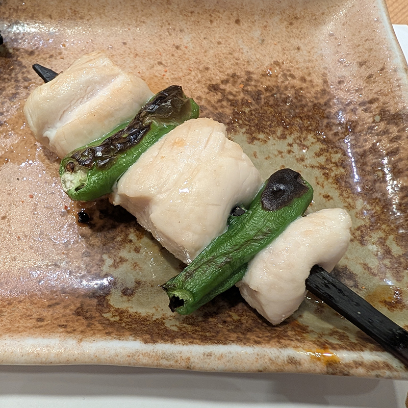 その食感が名古屋コーチンになるとより顕著になる。より弾力性のあって筋肉質。こちらにもシシトウが。