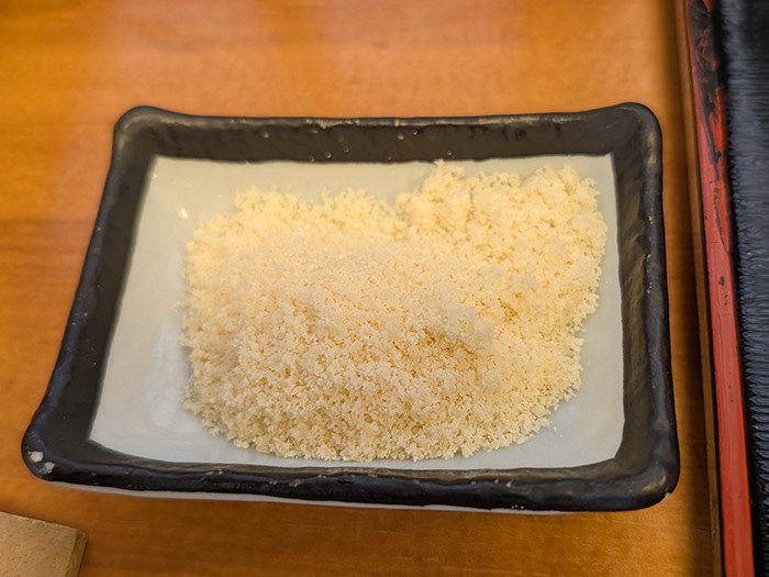 まずはスープを。もう少しとろみがついているものだと想像していたが、さらりとした口当たり。八丁味噌を使用しているのは明らかで味噌のコクと香りとまろやかさがあってこれはこれで悪くない。