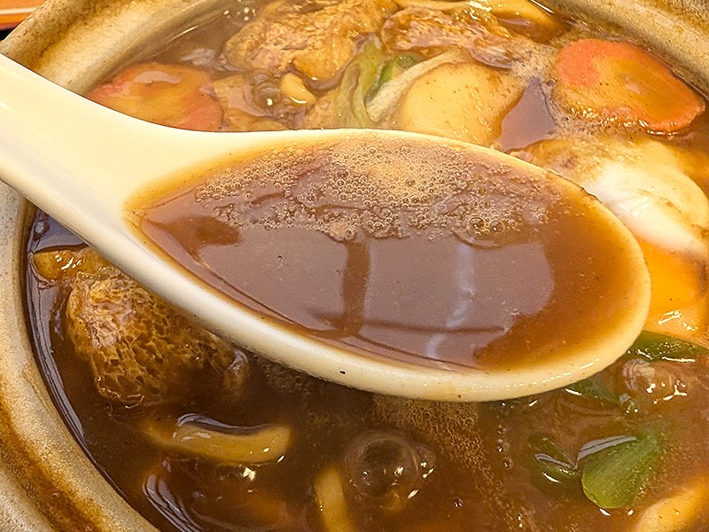 更に15分ほどして着丼。これにごはんを少々を追加。ぐつぐつと煮立った鍋からはカレーのいい香りが鼻をくすぐる。見た目は具材を含め、味噌煮込みうどんと変わらない様だ。