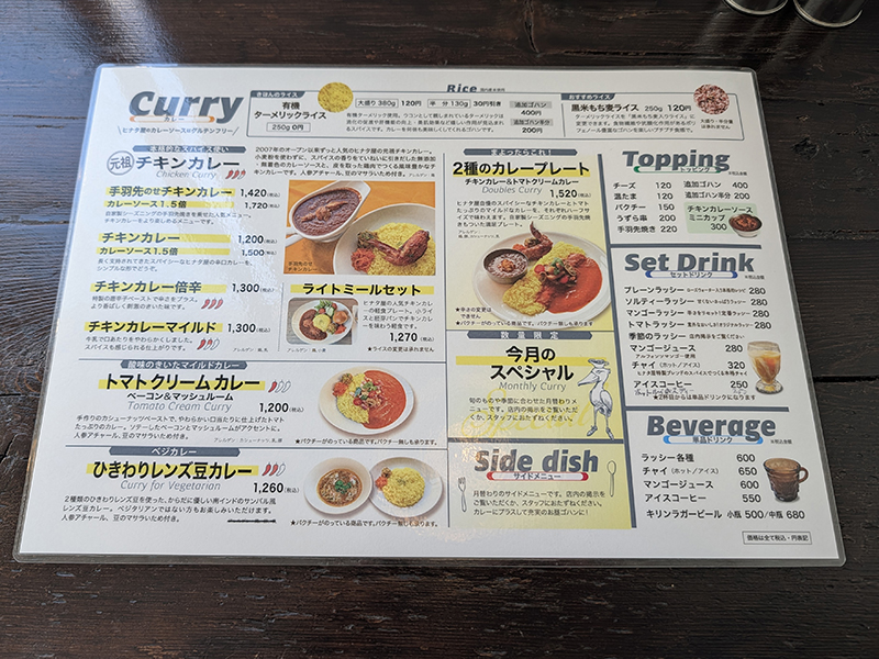 メニューは今月のスペシャルなどもあるが少数精鋭。基本的にチキンカレー押しであるのは間違いない。