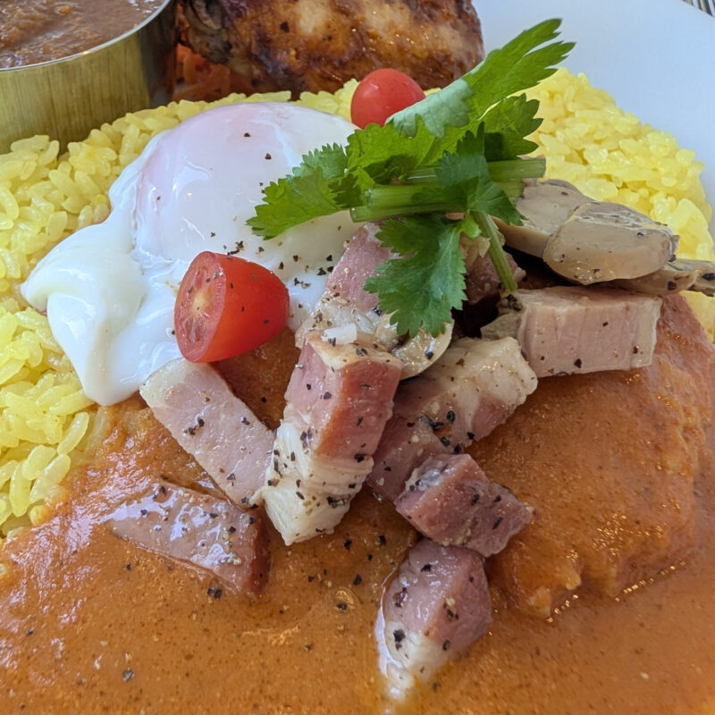 トマトクリームカレーは角切りのベーコンがゴロゴロと入り、自家製のカシューナッツペーストを使ったマイルドなカレーで辛さは全くない。辛さという点ではかなり物足りない。