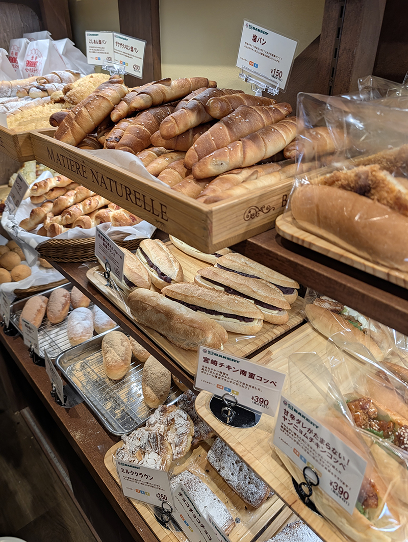 おかず系のパンが主流で種類も豊富。店内は決して広くはないが所狭しと商品が並んでいる。