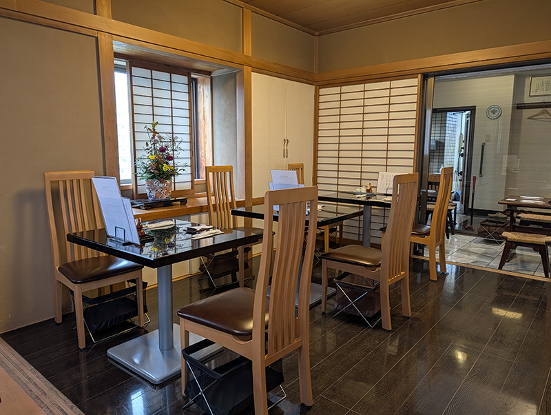 店内は落ち着いた空間でゆったりとした時間が流れいている。出窓には生け花が綺麗に飾られていておもてなしの心配りが感じられる。