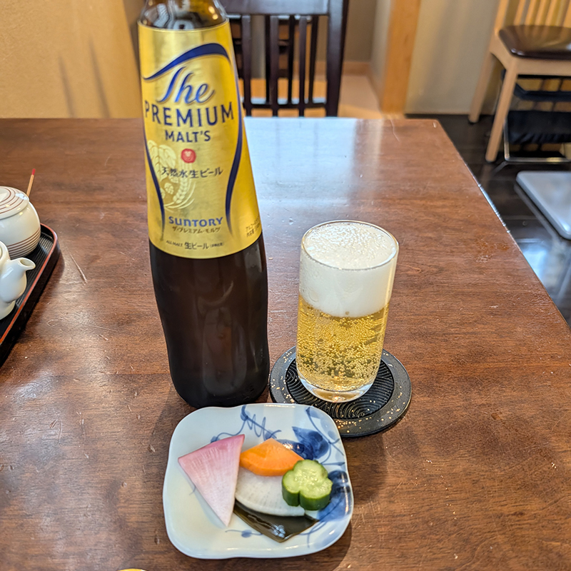プレモルの小瓶とつまみに玉子焼きと海老芋とにしんの炊き合わせを注文。
