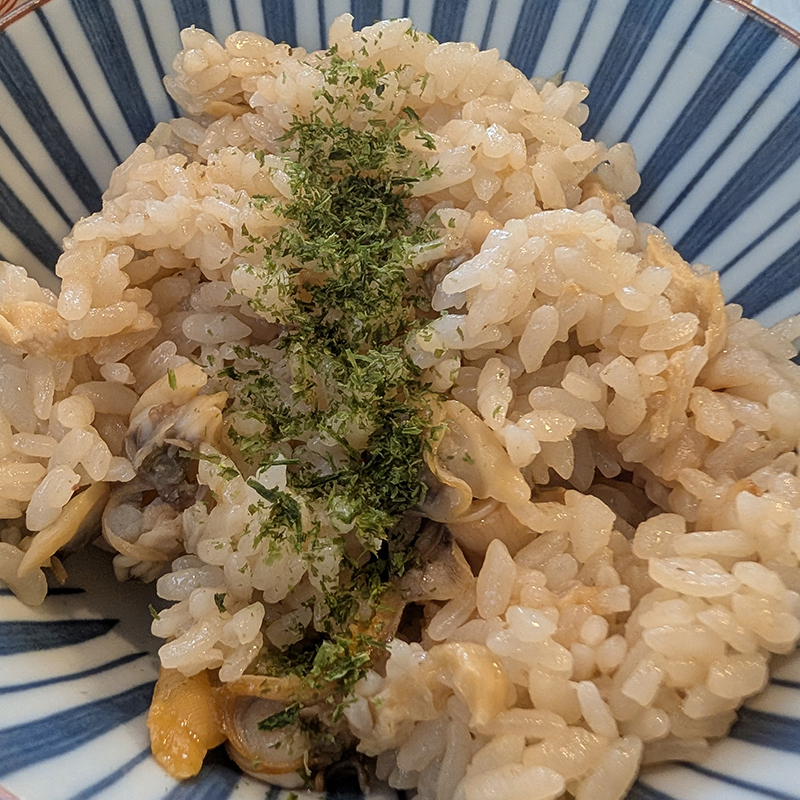 続いては限定6食という浅利の炊き込みご飯をお願いした。こちらも味付けは控えめだが青のりの香りがアクセントになった優しい味わい。