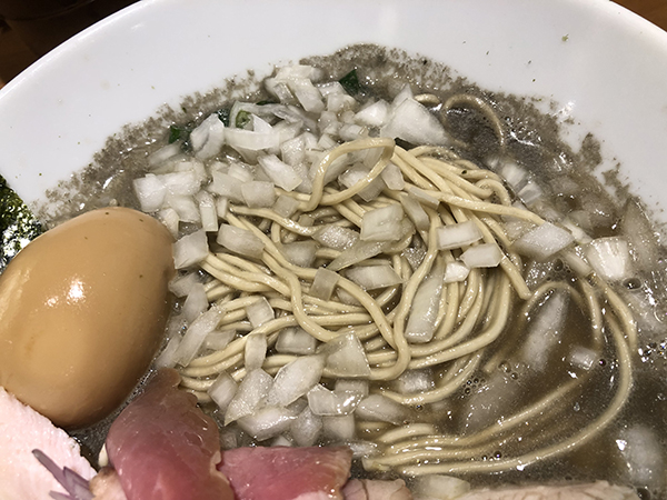 麺の上に盛られた玉ねぎのみじん切りがシャキシャキとした小気味いい食感を演出してくれる。