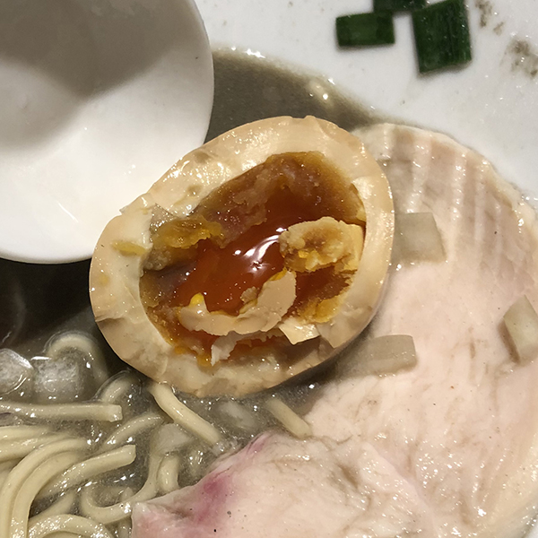 天敵である鶏チャーシューは肉そのものに臭みはなく、しっとりとした仕上がり。下味が強くない分、スープの強さが補っている印象だ。その他、玉子の塩梅もいい。