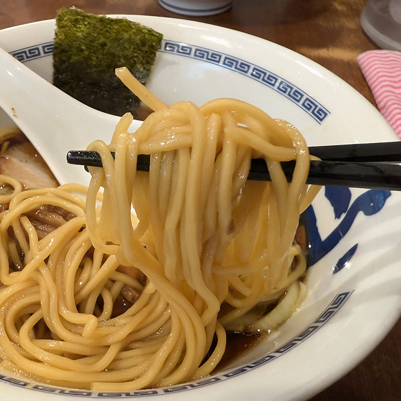 中太ストレート麺はもっちりとして旨味もある。スープとの相性もいい。