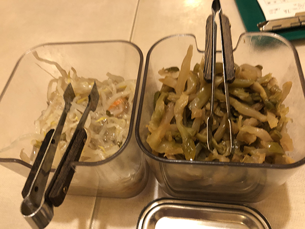 テーブルに置かれた2種類の漬物が食べ放題である。
