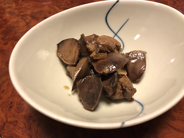 レバーと砂肝を煮たひと品。たまらず日本酒を注文。