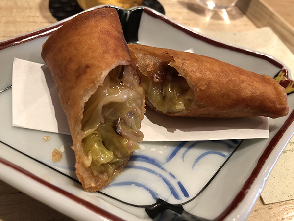 こちらは一転いい出来映えだ。揚げたての熱々で供される。皮はパリっと香ばしく、餡に使用されている白菜がトロリとした食感で味が染みていて素材の持つ甘みが心地いい。