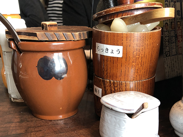 テーブルの上にある調味料類。らっきょうが食べ放題。