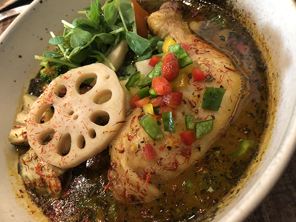 薬膳スープカレーと銘打っているだけにそれらしい香りが鼻をくすぐるが、想像よりも薬膳的な香りは穏やかである。スープはサラリとした液状でついついご飯の存在を忘れて飲み進めてしまう。