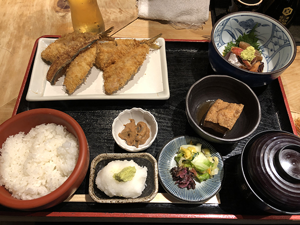 定食はアジフライのみ。実に潔い。これに汐辛と海鮮漬け小鉢が追加できる。