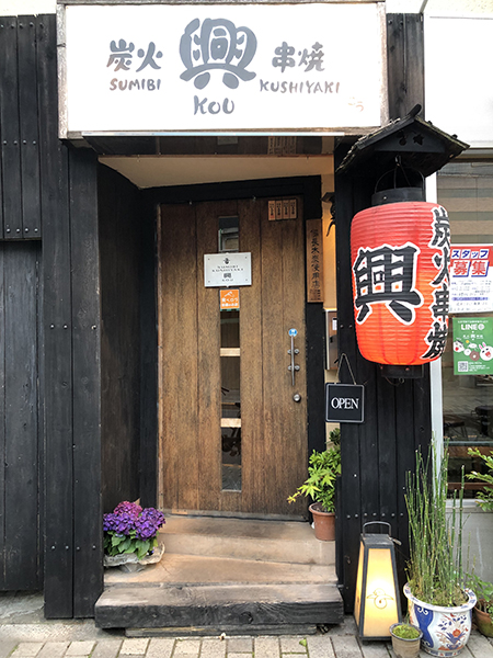 串ものを待つ間、ビールとお通しを。豆腐の上にわさびの茎が乗ったものですっきりとした爽やかな味わい。ひと口で留め、串の合間にリセットしてくれる緩衝材として頂く事に。