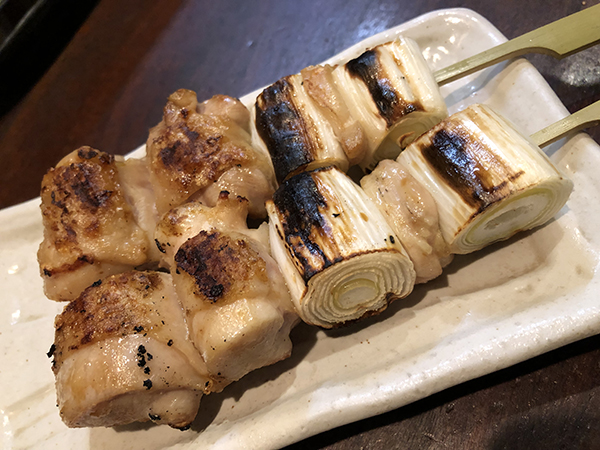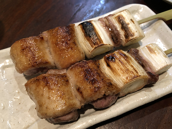 綺麗に切り揃えられて、串打ちされたもも肉とネギ。ものによっては塩かタレが選択できるのだが、こちらは塩のみとなる。皮目が香ばしく身はジューシーな仕上がり。ねぎまと言っても交互になっていないところが面白い。