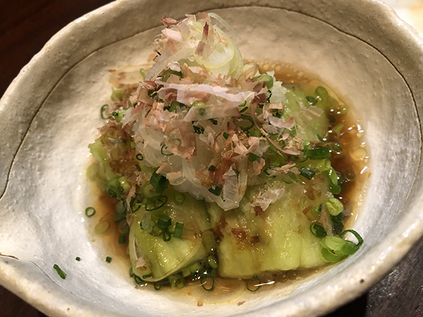 カウンターの上に置かれていた沢山の長なす。いまが旬という事から揚げ浸しで頂いた。