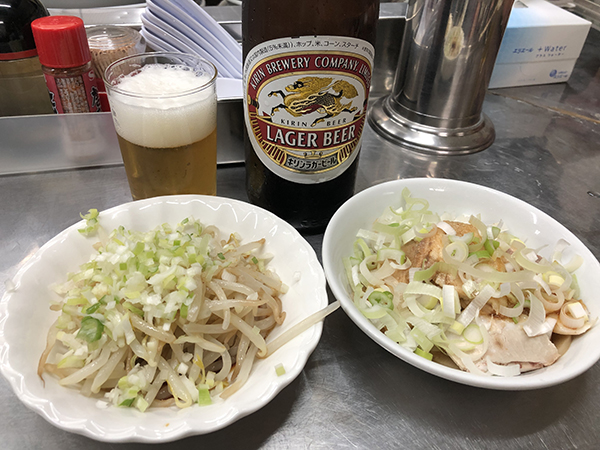 注文するものは毎度決まっていて、まずはビール、もやし、チャーシューで一杯。