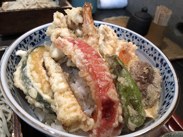 パプリカの赤が彩鮮やかで見た目にも楽しませてくれる。海老は入るが主役は野菜。ピーマン、かぼちゃ、椎茸、舞茸、ヤングコーンなど盛りだくさん。天丼としてよく出来ている。