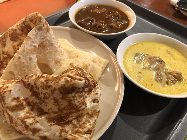2種類のカレーのセット。こちらには敢えてイエローライスやナンではなく、オリジナルのロティを合わせたが、正解だったようだ。ふんわりモチモチとした食感が心地よく、カレーとの相性も申し分ない。