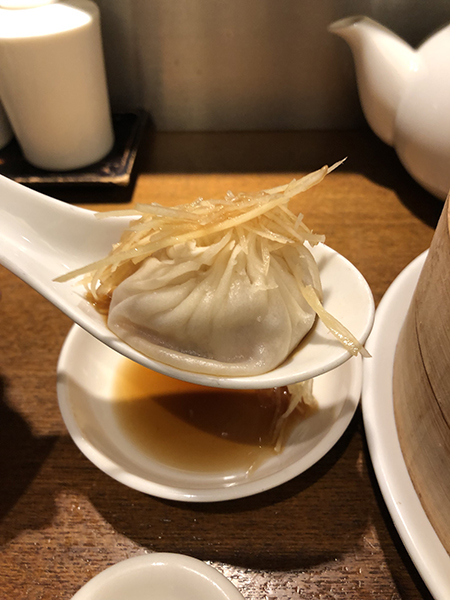 先程の取り皿に入れた黒酢を付けて、小籠包の上に生姜を乗せて頂く。