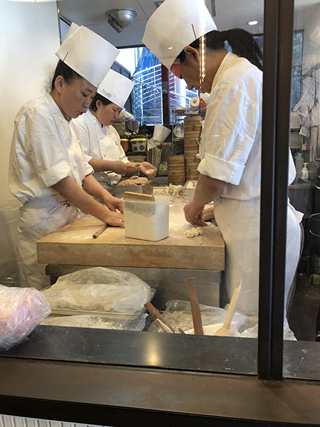 店の入口にはガラス越しに小籠包を作るところが見られるのだが、その場で皮をのし、餡を包んでいる。