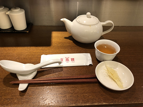 注文を終えると中国茶と小籠包で使用する生姜が入った取り皿が運ばれてくる。