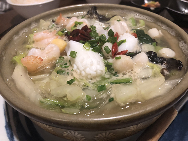 今回は海鮮に牛肉で使用する辛い味噌を別皿で頂いた。