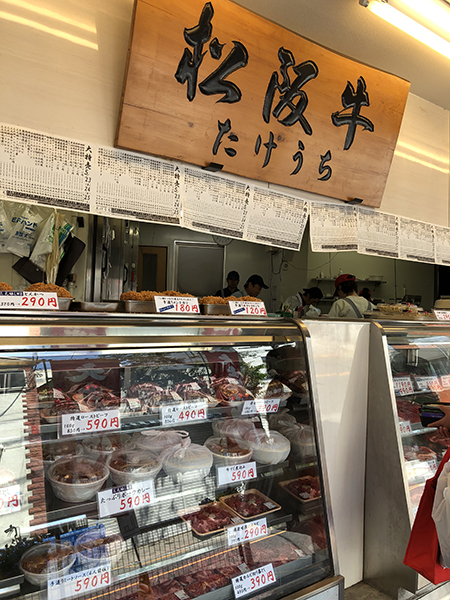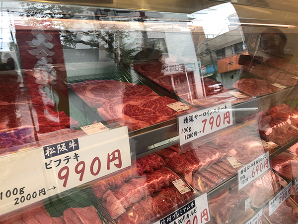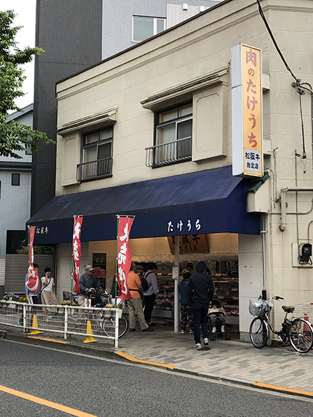 正庭通りにある松坂牛を扱う精肉店で、店先に掲げられた大売出しののぼりが目印。