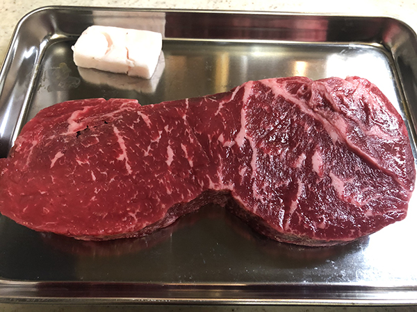 初回訪問時に購入したのが赤身肉のステーキ。100gで590円台。