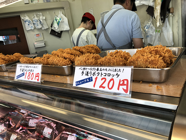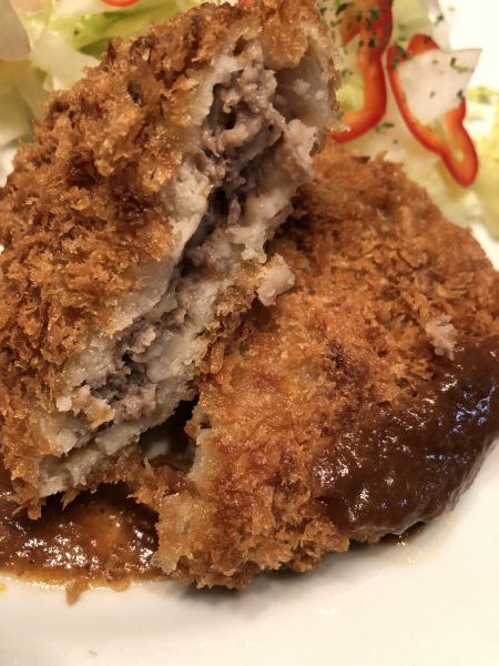 ポテトコロッケとメンチカツのちょうど中間と言った具合で衣の下にじゃがいも層があり、挽肉はその下にある。折角なら挽肉オンリーで行って欲しい。