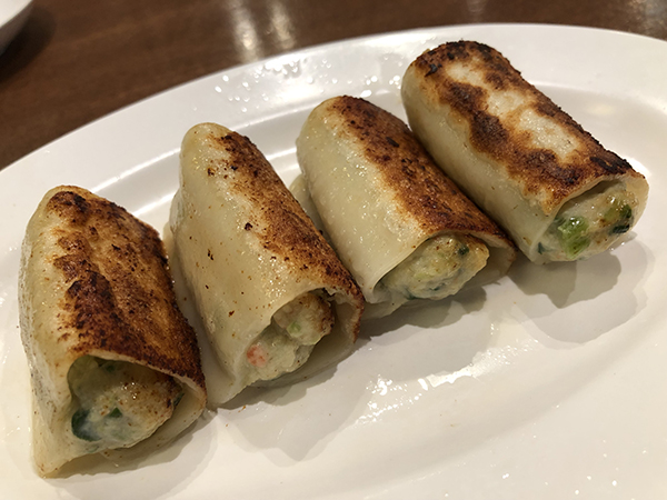 両端が閉じられていない変わったスタイルの焼き餃子である。皮のもっちり感、餡のバランスもいい。
