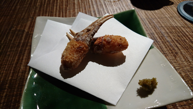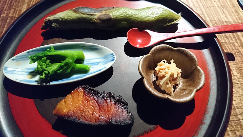 燻製とも違う深い味わい。身はしっかりとした食感で噛めば噛むほど、じんわりと旨味がこみ上げてくる。酒のアテとしてはこの上ない。添えられた付け合せはどれもいいのだが、面白いのは空豆の殻の内側の髭の部分。あまり、食べようと思わない部分だが、これが味が濃くて味わい深い。
