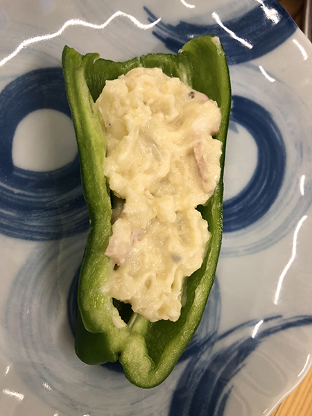 お店が推奨するピーマンにポテトサラダを乗せて頂く食べ方が思いの外、相性がいい。