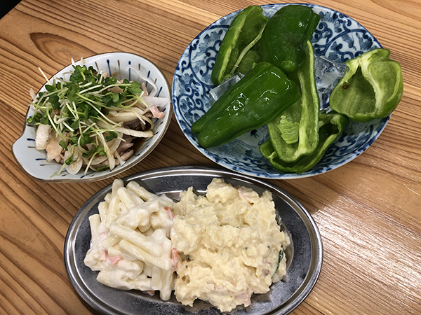 マカロニサラダとポテトサラダの盛り合わせに酢もつと冷やしピーマン。