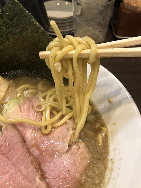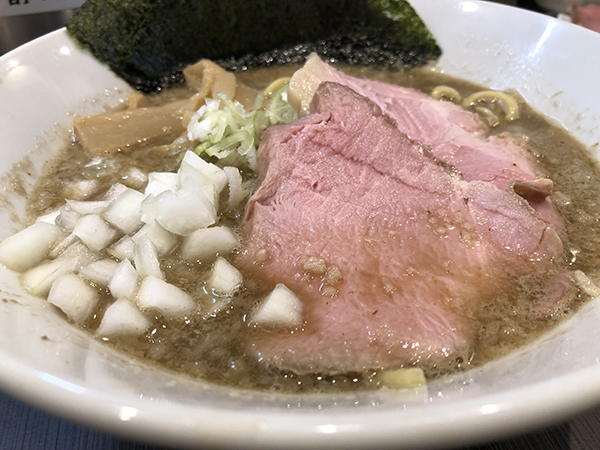 中太の麺はスープによく絡む。粗みじんのタマネギがいい緩衝材になってくれる。