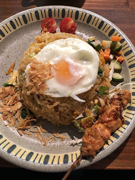 ナシゴレンの上には目玉焼きが乗り、周囲を野菜が彩る。そしておかずとして串が一本付いてくる。