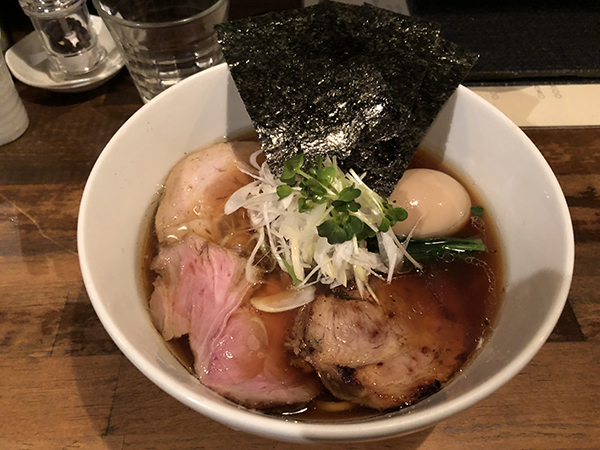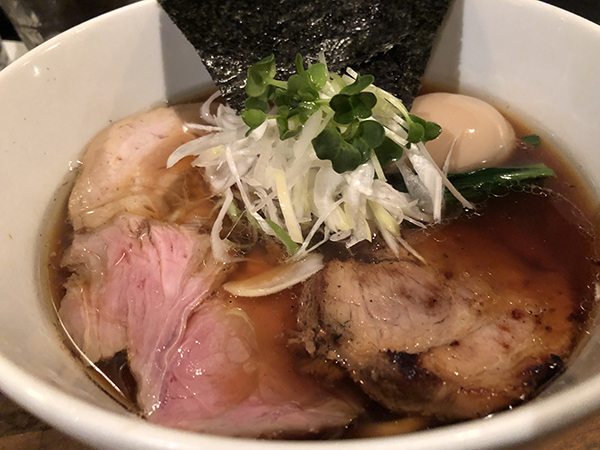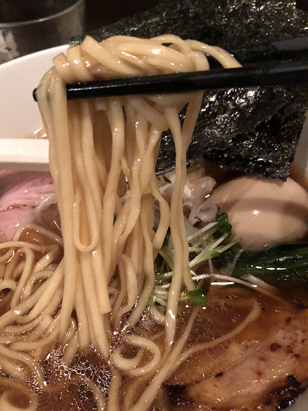 スープは色がしょうゆの色濃く、透明感が高い。まずはそのスープから頂く。見た目を裏切らないしっかりとした醤油の風味に支えられ、丸みがあり、バランスがいい仕上がり。比内鶏、大山鶏、岩中豚でとったダシをベースに、数種類の干物からとった魚介出汁を合わせているだけあって、しっかりとコクもある。