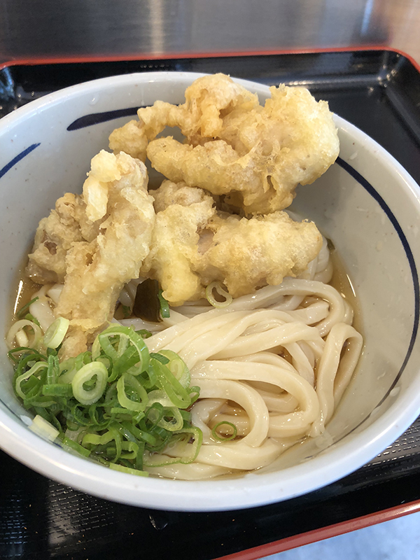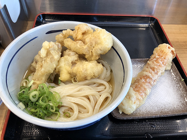 うどんはとり天ちくわ天の冷やぶっかけにして、天ぷらを合いの手にビールを一献。