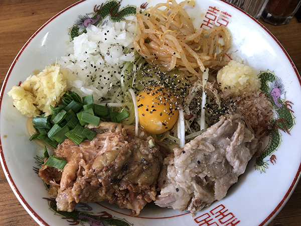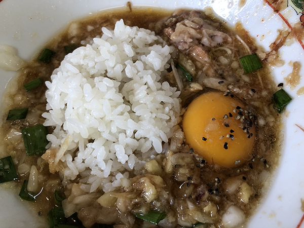 汁なしは汁なしで想像していたよりもよく、二郎っぽいエッセンスが感じられる。これは暑い日などには良さそうだ。また、前回、頼まなかったトッピングのナンコツは、コリコリしたものと考えていたが、これがナンコツ?というただの柔らかい肉だった。最後に追い飯があるが、ご飯は少量なのでそれほど負担にはならない。