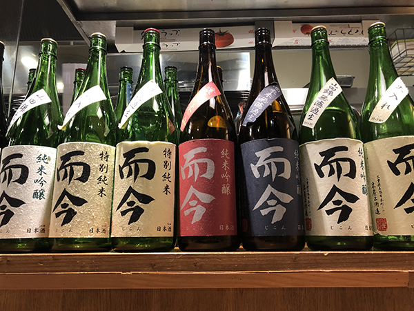 店内はカウンターとテーブル席があり、かなりキャパシティである。昼はとんかつ屋として営業し、夜は居酒屋に変わる。カウンターの上には而今と十四代の瓶がズラリと並ぶ。