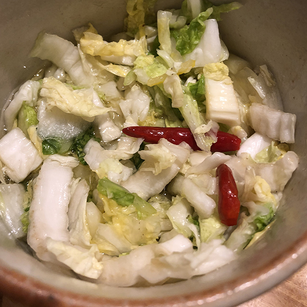 卓上にはお新香が壺に入っていて好きなだけ取る事ができる。この日のお新香は白菜。