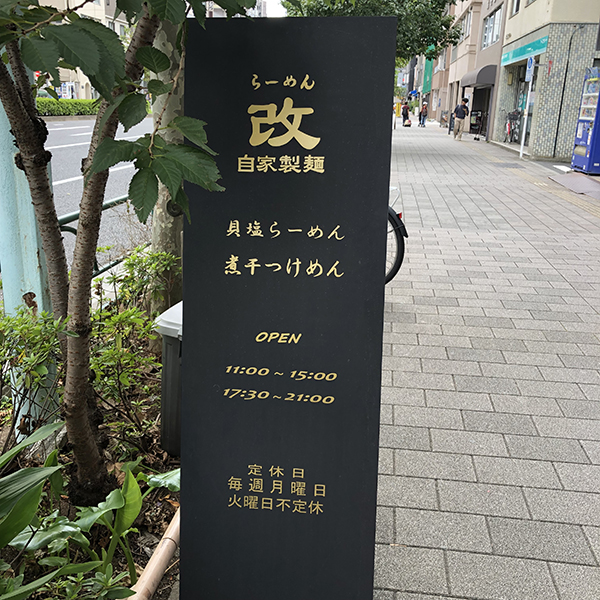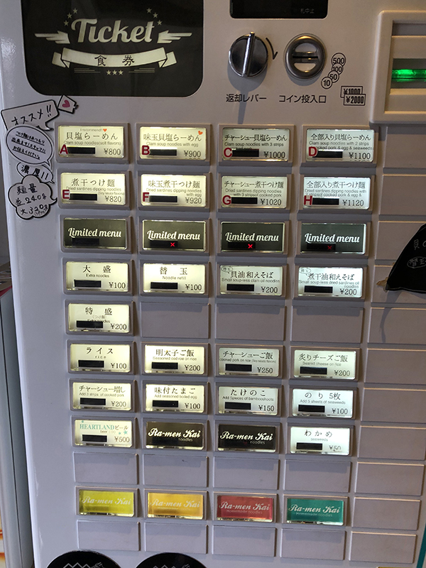 入口で食券を購入メニューは大きく貝ダシを使った貝塩らーめんと煮干しつけ麺の2種類に分かれる。