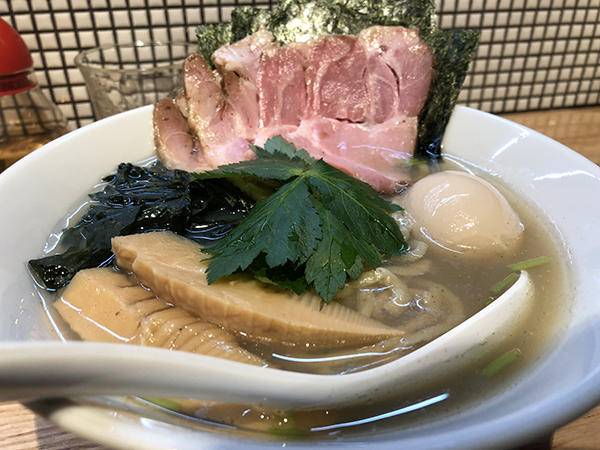 まずはスープをひと口。温度はかなり高めで熱々の状態である。サラリとした口当たりだが、貝の香りが色濃く、少しクセがあるというのが第一印象だ。