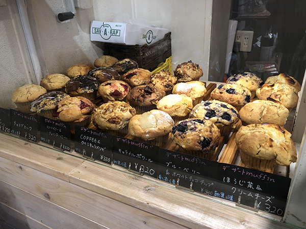店内に入り、ショーケースを覗くと20種類近い、色とりどりのマフィンが並ぶ。