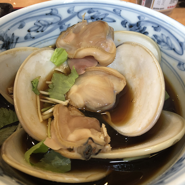 つゆは藪系に近いかなりの濃口だが、はまぐりの出汁がいい具合に丸みと深みを与えてくれる。
