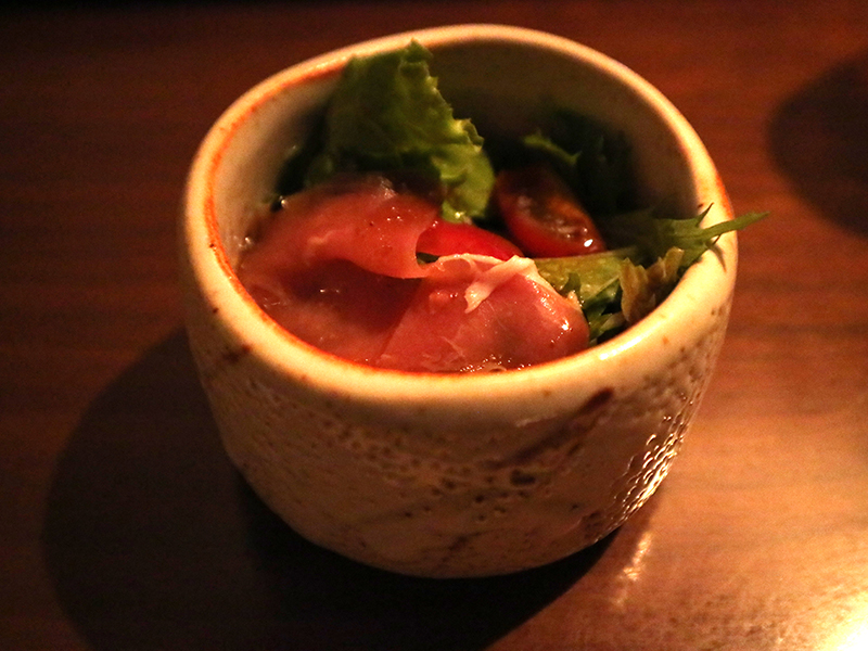 最初に供されたのは生ハムのサラダ。和食ではないところからのスタート。予想外の滑り出しだ。