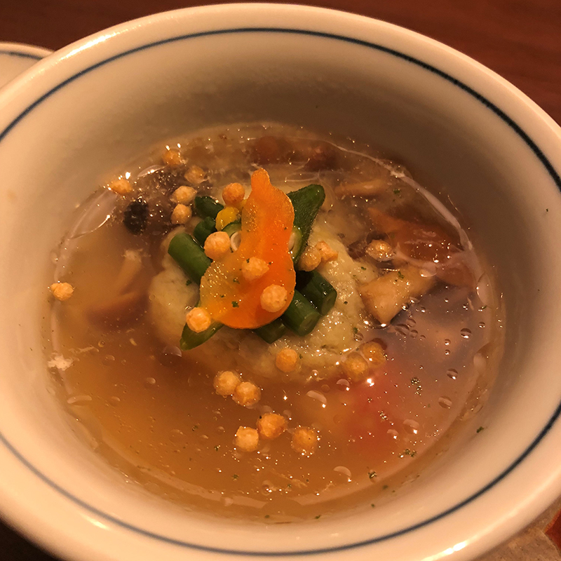 しっかりと丁寧に出汁がとられている。かつお節の出汁が効いた、少しとろみがついたタイプでキノコ類など具だくさん。