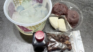 塩気が効いた豆かんと2種類の餡が楽しめるあんみつ